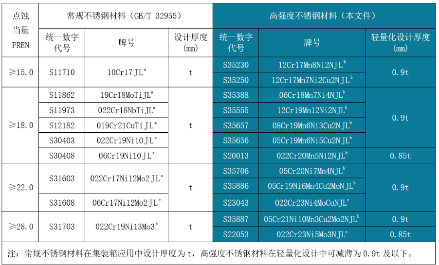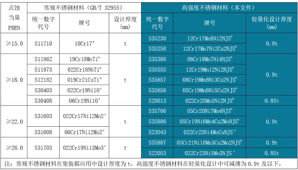 表1:冷藏集装箱用高强度不锈钢轻量化推荐设计表(摘录于YB/T 6352-2025附录D)